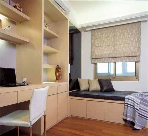男孩房強(qiáng)調(diào)實(shí)用機(jī)能,藉由上下空間的利用讓臥室空間擁有更寬敞舒適的場(chǎng)域,下方為書桌,上面是臥舖,并在樓梯處設(shè)計(jì)收納空間,巧手改善空間缺陷,并以獨(dú)特而創(chuàng)新的設(shè)計(jì)傳達(dá)出趣味橫生的居家感受。