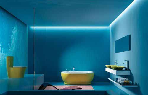 藍(lán)色的衛(wèi)浴空間帶來的是一種對(duì)海的想象空間,黃色的衛(wèi)浴產(chǎn)品讓色彩在空間里跳躍,輕松活潑。